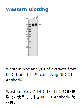 NKCC1 Antibody 兔多抗识别内源性的NKCC1 总蛋白。该多克隆抗体由合成的人类NKCC1蛋白Pro128位点附近肽段免疫动物而制成。该抗体使用蛋白A和多肽亲和层析纯化而得。在电中性阳离子-氯耦合共转运(SLC12)基因家族包括布美他尼敏感的Na+/H+/Cl-(NKCC),噻嗪类敏感的Na+/Cl-,K+/CL-(KCC)共转运体。SLC12A1/NKCC2和SLC12A2/NKCC1调节细胞体积和维持细胞响应渗透和氧化应激时的稳态(1)。广泛表达NKCC1被认为在液体分泌(如唾液腺功能),水盐平衡(如维持肾素和醛固酮水平),以及神经元的发育和信号传导中发挥作用(2-7)。在神经发育中,NKCC1和KCC2在在氯离子涌入(NKCC1)和流出(KCC2)中维持良好平衡,调节γ-氨基丁酸(GABA)介导的神经传导(3)。在未成熟神经元中增加的NKCC1表达可以维持细胞内的氯的高水平,产生抑制性GABA能信号;KCC2在成熟神经元中保持细胞内氯的低水平,产生兴奋性GABA能反应(4,5,8)。删除NKCC1会损害神经生长因子介导的PC-12D细胞的突起生长,用布美他尼抑制NKCC1会抑制切断的背根神经节细胞的重新生长(6,7)。氯稳态缺陷的神经元与癫痫相关,这种癫痫可被butemanide治疗改善,这表明NKCC1和NKCC2异常表达或其信号通路可能在新生儿和成人癫痫中发挥作用(9-12)。NKCC1是作为二聚体和与其它SLC12家族成员形成异寡聚体被发现的。这种运输蛋白与氧化反应和渗透反应激酶结合,结合、磷酸化和激活NKCC1共转运体的活性(13-16)。为了应对降低的细胞内氯离子浓度,STE20相关的富含脯氨酸丙氨酸的蛋白激酶(SPAK)磷酸化NKCC1,增加共转运活动,促进氯离子涌入(16-19)。氧化应激反应激酶1(OSR1)在氧化应激反应中磷酸化和激活NKCC1(14)。