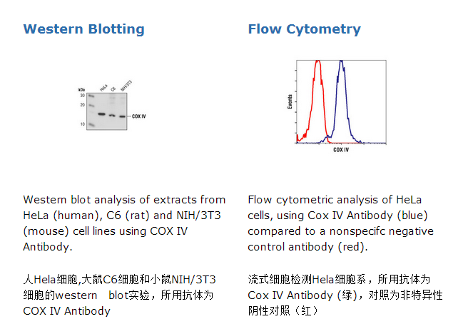 Cytochrome c oxidase (COX) is a hetero-oligomeric enzyme consisting of 13 subunits localized to the inner mitochondrial membrane (1-3). It is the terminal enzyme complex in the respiratory chain, catalyzing the reduction of molecular oxygen to water coupled to the translocation of protons across the mitochondrial inner membrane to drive ATP synthesis. The 3 largest subunits forming the catalytic core are encoded by mitochondrial DNA while the other smaller subunits, including COX IV, are nuclear-encoded. Deficiency in COX activity has been correlated with a number of human diseases (4). The COX IV antibody can be used effectively as a mitochondrial loading control.