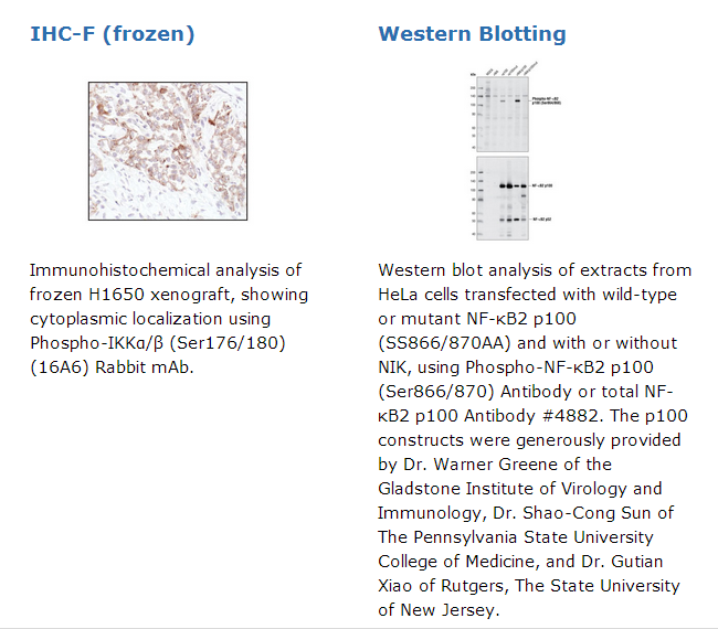 The Phospho-IKKα/β (Ser176/180) (16A6) Rabbit mAb detects IKKα only when phosphorylated at Ser176/180 and IKKβ only when phosphorylated at Ser177/181. The Phospho-NF-κB2 p100 (Ser866/870) Antibody detects transfected levels of NF-κB2 p100 only when phosphorylated at Ser866/870. The TRAF2, TRAF3, IKKα, RelB, and p100/p52 antibodies detect endogenous levels of total protein of their respective targets. The NIK antibody detects transfected levels of NIK regardless of modification state.