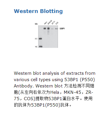 53BP1 (P550)抗体检测内源性53BP1总蛋白的水平。该多克隆抗体是由合成的人源的针对53BP1蛋白丝氨酸(552位)磷酸化肽段免疫动物而生产的。p53结合蛋白1(p53 binding protein 1,53BPl)最初被认为是一种p53的结合蛋白,其功能是增强p53基因的转录活性。53BP1通过其两个BRCA1羧基末端(BRCT)结构域与p53基因结合,通过另外一个独立的结构域与磷酸化组蛋白H2A.X结合。电离辐射(IR)或者辐射类物预处理细胞后,可引起DNA双链断裂(DSBs),53BP1蛋白迅速转移到核内。鉴于DNA断裂后53BP1的定位改变及其与酵母蛋白Rad9的同源性,人们提出53BP1可能在DNA双链断裂后的修复过程中起到一定的作用。53BP1聚集到DNA损伤处的过程不依赖于ATM,NBS1,和DNA-PK,但是其在DNA断裂处的滞留依赖于磷酸化H2A.X。在53BP1表达缺失的细胞中,ATM底物的磷酸化程度降低,提示53BP1在ATM上游起作用。电离刺激后,53BP1在丝氨酸6,25,29以及784位被ATM磷酸化,但是这些位点的磷酸化并不影响53BP1在DNA双链断裂处的聚集。