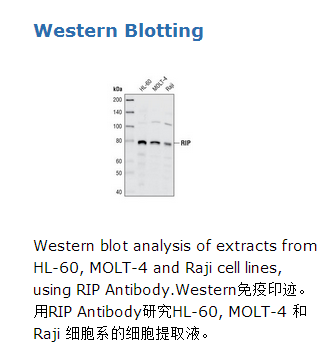 RIP 抗体能够检测内源水平RIP (RIP1)蛋白。此抗体不与其它家族的成员交叉反应。此抗体也能检测到caspase-8依赖剪切的45 kDa RIP蛋白C-末端片段。此多克隆抗体是通过合成人源对应的RIP Arg413位点周围的肽段来免疫动物而获得。抗体是通过protein A和多肽亲和层析纯化。RIP (受体互作蛋白)家族丝氨酸-苏氨酸激酶(RIP, RIP2, RIP3 and RIP4)是细胞胁迫的重要调控因子,它能够通过NF-κB信号通路和促凋亡通路而引起存活和炎症反应(1)。除了激酶区域, RIP也包含了死亡域,它能够死亡域受体Fas相互作用并通过与TRADD的相互作用招募到TNFR1上(2,3)。RIP也与TNF受体相关的因子(TRAFs)并且通过与NEMO的相互作用招募IKKs到TNFR1信号复合体上从而引起IκB的磷酸化及降解(6,7)。过表达RIP能够诱导NF-κB的激活和凋亡(2,3)。Caspase-8依赖的对RIP死亡域的剪切能引起其凋亡活性(8)。RIP缺失的细胞在TNF介导的NF-κB激活从而引起细胞对凋亡更为敏感方面的功能缺失(4,5)。