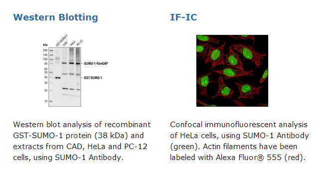 利用与人SUMO-1蛋白的氨基酸序列相对应的(与SUMO-2/3没有交叉)肽段,免疫动物获得此多克隆抗体,然后利用protein A和肽亲和层析纯化抗体。 Western blot analysis of recombinant GST-SUMO-1 protein (38 kDa) and extracts from CAD, HeLa and PC-12 cells, using SUMO-1 Antibody. 使用SUMO-1抗体对GST-SUMO-1重组蛋白(38 kDa)和CAD、HeLa和PC-12等细胞裂解物进行免疫印迹分析的结果。 Immunohistochemical analysis of paraffin-embedded human breast carcinoma, using SUMO-1 Antibody. 使用SUMO-1抗体对石蜡包埋的人乳腺癌切片进行免疫组化分析的结果。 Immunohistochemical analysis of paraffin-embedded human colon carcinoma, using SUMO-1 Antibody. 使用SUMO-1抗体对石蜡包埋的人结肠癌切片进行免疫组化分析的结果。 Immunohistochemical analysis of paraffin-embedded human lung carcinoma, usinig SUMO-1 Antibody. 使用SUMO-1抗体对石蜡包埋的人肺癌切片进行免疫组化分析的结果。 Confocal immunofluorescent analysis of HeLa cells, using SUMO-1 Antibody (green). Actin filaments have been labeled with Alexa Fluor®555 (red). 使用SUMO-1抗体对HeLa细胞进行共聚焦免疫荧光分析的结果(绿色),微丝被Alexa Fluor®555标记(红色)。