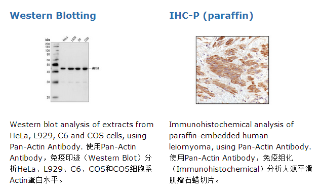 Pan-Actin Antibody detects endogenous levels of total actin (all isoforms). The antibody also detects the 30 kDa actin fragment cleaved at glutamate 107.