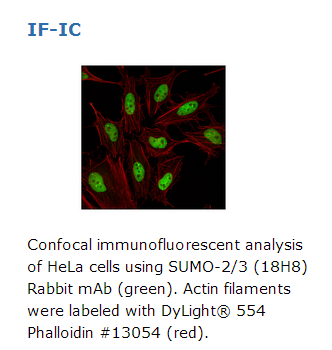 SUMO-2/3 (18H8)兔单抗识别内源性的SUMO-2/3蛋白,与重组SUMO-1蛋白无交叉反应。