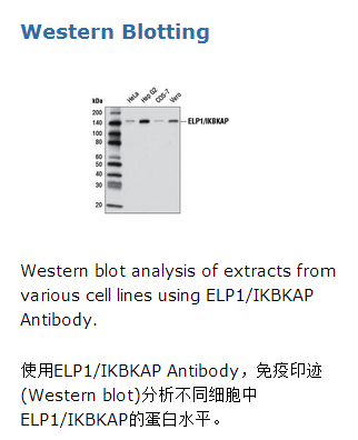 ELP1/IKBKAP Antibody能够检测内源性ELP1/IKBKAP总蛋白水平。通过合成的人源ELP1/IKBKAP蛋白羧基端相应的多肽片段去免疫动物从而制备出此多克隆抗体。通过蛋白A和多肽亲和层析纯化获得。