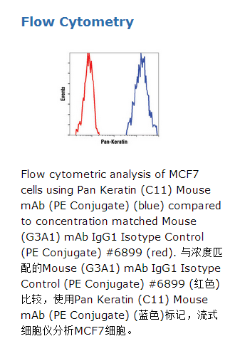 Pan-Keratin (C11) Mouse mAb (PE Conjugate) detects endogenous levels of total keratin 4, 5, 6, 8, 10, 13 and 18. The antibody does not cross-react with other keratins.