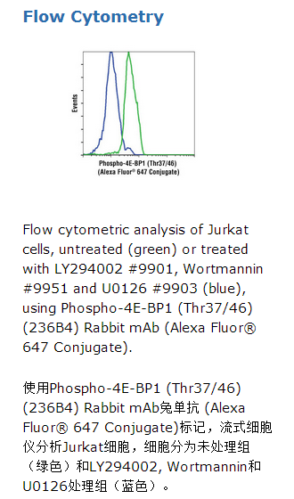 Phospho-4E-BP1 (Thr37/46) (236B4) Rabbit mAb 兔单抗(Alexa Fluor® 647 Conjugate)检测仅在Thr37或Thr46位点磷酸化的内源性4E-BP1蛋白水平。该抗体可以与在等效位点磷酸化的4E-BP2和4E-BP3蛋白发生交叉反应。通过人工合成小鼠4E-BP1 蛋白Thr37和Thr46位点周围序列相应的多肽片段去免疫动物从而制备单克隆抗体。这个抗体以F/P 比值为2-5在最优条件偶联Alexa Fluor® 647。Alexa Fluor® 647染料可最大程度被红光激发(e.g. 633 nm He-Ne激光器)。偶联Alexa Fluor® 647染料的抗体能产生峰值为665 nm的远红外荧光发射。该CST抗体偶联Alexa Fluor® 647荧光染料,并用直标法流式细胞术在内部检测人类细胞。未接合的抗体Phospho-4E-BP1 (Thr37/46) (236B4) Rabbit mAb兔单抗 #2855可与人类、小鼠、大鼠和猴子的磷酸化4E-BP1 (Thr37/46)蛋白发生反应。CST公司认为磷酸化4E-BP1 (Thr37/46) (236B4) Rabbit mAb兔单抗 (Alexa Fluor® 488接合)也将能识别这些物种磷酸化4E-BP1蛋白。翻译抑制蛋白4E-BP1 (又称 PHAS-1)通过结合翻译起始因子eIF4E蛋白从而抑制帽子结构依赖的翻译。4E-BP1的过磷酸化干扰上述结合并且导致激活帽子结构依赖的翻译(1)。PI3 kinase/Akt通路和FRAP/mTOR激酶通路都调节4E-BP1蛋白的激活(2,3)。在体内4E-BP1多个位点残基被磷酸化(4)。通过FRAP/mTOR蛋白使4E-BP1在Thr37和Thr46位点磷酸化不能阻止它eIF4E结合,但这被认为是为随后在4E-BP1的Ser65和Thr70位点磷酸化进行准备(5)。