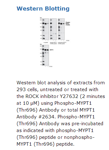 Polyclonal antibodies are produced by immunizing animals with a synthetic phosphopeptide corresponding to residues surroundiing Thr696 of human MYPT1. Antibodies are purified using protein A and peptide affinity chromatography.