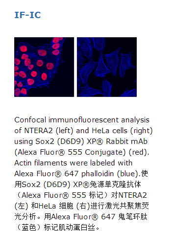Sox2 (D6D9) XP® Rabbit mAb(Alexa Fluor® 555偶联)可以识别内源性的Sox2蛋白。多克隆抗体是通过一种合成的肽段去免疫动物产生。这种合成的肽段与邻近人源Sox2蛋白Gly179的氨基酸残基序列一致。Cell Signaling Technology公司抗体与Alexa Fluor® 555 荧光染料偶联,对人细胞经免疫荧光分析进行内部测试。本抗体与无偶联的Sox2 (D6D9) XP® Rabbit mAb #3579有同样的种属交叉反应性。胚胎干细胞分离自囊泡的内细胞团,并有独特的多分化潜能和自我更新潜能。Sox2是一种对于保持细胞多潜能性起关键作用的转录因子(1)。Sox2, Oct-4和Nanog在调控网络中协同作用(1-3)。表达Sox2 或 Oct-4的siRNA诱导沉默会导致细胞多潜能性的丢失(4,5)。染色质免疫沉淀实验显示Sox2和 Oct-4能结合到数千个基因的调控位点,显示了这些转录因子在胚胎早期发育中的重要性(6,7)。最近的研究发现Sox2基因在肺癌和食管鳞癌中扩增(8).
