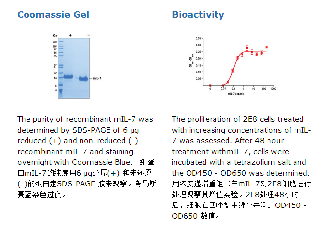 CST公司在大肠杆菌中生产重组鼠蛋白IL-7 (mIL-7) Glu26-Ile154 (Accession #NP_032397)。重组的hIL-8蛋白在N-末端有Met标签,分子量据推算为15,028Da。DTT-还原和未还原的蛋白迁移时是作为一个14kDa 的多肽而转移,重组mIL-7蛋白的N-末端MECHI的序列通过测序确定。6 μg 还原 (+) 和 非还原的(-) mIL-7通过SDS-PAGE检测,纯度大于98%,所有批次的纯度均高于98%。重组蛋白mIL-7的生物活性是通过2E8细胞增值实验确定的。每个批次的ED50在60-200 pg/ml之间。内毒素含量:<0.01 ng /1 μg mIL-7。