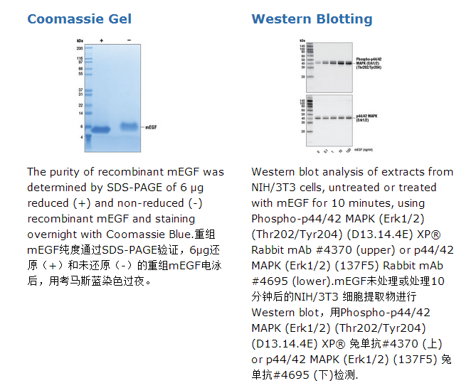在Cell Signaling Technology公司,在大肠杆菌中表达重组鼠源蛋白EGF (mEGF) Asn977-Arg1029 (Accession #NP_034243) 。重组的mFGF氨基末端含有甲硫氨酸,计算得到的分子量为6045.DTT-还原和非还原状态下蛋白迁移状态与6KDa多肽相同。重组mFGF氨基端序列MNSYP通过氨基酸测序确认。6 μg还原和未还原的mEGF由SDS-PAGE测定纯度大于98%。所有批次的产品纯度均大于98%重组mEGF使用NIH/3T3细胞扩增实验检验其生物活性。每个批次的ED50值都在40-250ng/ml。1ug mEGF所含内毒素少于0.01ng。带载体:每1 μ mEGF溶于含有20 mM柠檬酸盐、100mM氯化钠、20 μgBSA、pH3.0的溶液经0.22 μm滤器过滤的溶液后冻干。无载体:经0.22 μm滤器过滤的20 mM柠檬酸盐、100mM氯化钠、pH3.0的溶液的冻干物。EGF存在于上皮细胞,成纤维细胞和许多其他的细胞类型中(1,2)。低分子量可溶型EGF由一个分子量超过130,000的跨膜前体蛋白经蛋白水解生成(1,2)。可溶型和跨膜EGF都是有活性的(2)。EGF可以诱导多种细胞包括肿瘤来源的细胞增殖,分化和存活(1-3)。EGF家族和ErbB/HER EGF受体家族有许多成员。EGF结合ErbB1/HER1诱导同源二聚化或与其他ErbB/HER成员的异源二聚化(1)。EGF,EGF家族成员,EGF受体和它们的信号通路涉及到多种癌症,可以作为介入治疗的靶点(1,2)。