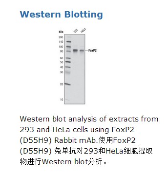 FoxP2 (D55H9)Rabbit mAb 兔单抗识别内源性的总FoxP2蛋白。合成与人源FoxP2蛋白的邻近Leu623氨基酸残基序列一致的肽段,免疫动物获得单克隆抗体。叉头盒蛋白(Fox)是一组进化中较保守的转录因子,它们拥有一个翼状的螺旋DNA结合结构域而被称为叉头盒(1)。人体内,有超过43种不同亚型的Fox蛋白。FoxP亚家族有4个成员FoxP1到FoxP4,它们表达广泛,并且在器官发育,免疫反应和癌症病理等过程中扮演重要角色(2-4)。FoxP亚家族有几个不同于其他Fox蛋白的特征:它们的叉头盒位于羧基端,它们包含有促进同源和异源二聚化的基序。FoxP蛋白通常作为转录抑制因子(4,5)。FoxP2调控肺和神经系统发育(6-10)。FoxP2发生包括点突变,截断,缺失和染色体易位在内的突变都与遗传性的演讲和语言障碍有关(11,12)。
