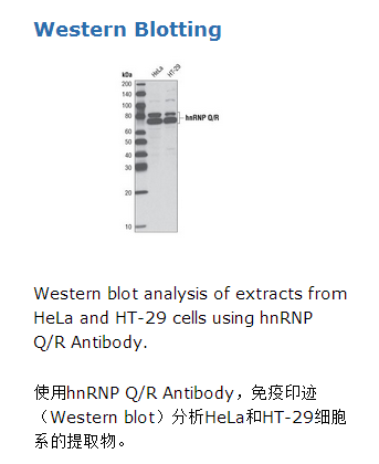 Polyclonal antibodies are produced by immunizing animals with a synthetic peptide corresponding to residues near the carboxy terminus of human hnRNP Q. Antibodies were purified by protein A and peptide affinity chromatography.