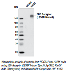 EGFR(L858R 特异突变)的兔源单克隆抗体(43B2) (生物素化)能检测内源L858R 位点突变的EGFR蛋白的水平。为获得最佳特异性本抗体需要仔细滴定。单克隆抗体通过免疫动物得到,作为免疫源的合成多肽根据人EGFR蛋白L858R位点突变序列合成。本CST公司生产的抗体在最佳条件下与生物素偶联。该生物素偶联的抗体具有和未偶联生物素的抗EGFR(L858R 特异突变)的兔源单克隆抗体(43B2) #3197相同的物种交叉反应特性。表皮生长因子(EGF)受体是一个属于HER/ErbB蛋白家族的跨膜酪氨酸激酶,大小170kDa。EGFR酪氨酸激酶区域的体细胞突变在肺腺癌的亚分类中有发现(1-3)。其中两种突变大约占了所有突变类型的90%:一个是发生在21外显子上L858R位点的点突变,另一个是19外显子内部的短片段缺失(4,5)。19外显子异常虽然有多种形式,但常见的是E746-A750的缺失。