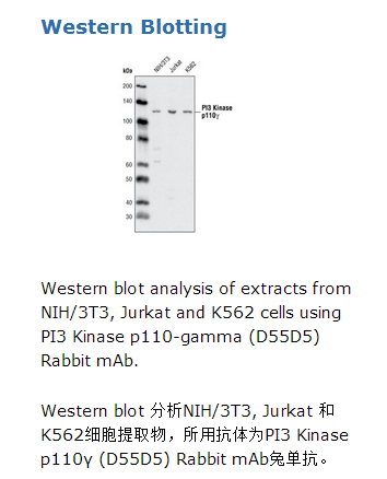 PI3 Kinase p110γ (D55D5) Rabbit mAb兔单抗可以检测出内源性总PI3K p110γ蛋白。单克隆抗体是采用人类PI3K p110γ蛋白周围残基相对应的合成肽段免疫动物生产的。PI3K激酶通过磷酸化磷脂酰肌醇(PI), 4-磷酸磷脂酰肌醇 (PIP)和4,5-二磷酸磷脂酰肌醇 (PIP2)催化3,4,5-三磷酸磷脂酰肌醇的产生。生长因子和激素会引发该磷酸化进程,随后协助细胞生长,细胞周期进入,细胞迁移和细胞存活(1)。PTEN会逆转该过程,研究表明PI3K信号通路在PTEN功能缺失的人类癌症中是持续性激活的(2)。PI3Ks由一个催化亚基(p110)和一个调控亚基构成。已经分离得到了多个催化亚基(p110α, p110β, p110γ, 和p110δ),与p110α, p110β, 和 p110δ结合的调控亚基是p85α 和 p85β (3).相对的,与p101调控亚基结合的p110γ与p85无关。此外,异源三聚体G蛋白的βγ亚基可以激活p110γ(4)。