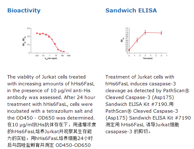 CST公司生产的人重组蛋白His6FasL (hHis6FasL) Pro134-Leu281 (Accession #NP_000630)是从人的293细胞表达而来。重组的hFasL蛋白在N-末端有His6标签,蛋白分子量据推算为19,834Da。DTT-还原的蛋白和未还原的蛋白作为31-36kDa的多肽而迁移。在SDS-PAGE中较低的迁移率是由于糖基化的作用。6 μg 还原 (+) 和 非还原的(-) 重组hHis6FasL通过SDS-PAGE检测,纯度大于98%,所有批次的纯度均高于98%。hHis6FasL的生物活性是通过Jurkat细胞生存能力的实验来确定的。每个批次的ED50在1-5 ng/ml之间。每微克hFasL内毒素含量小于0.01 ng。