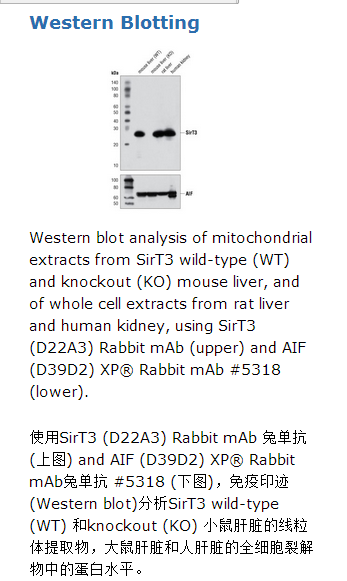 SirT3 (D22A3) Rabbit mAb兔单抗能够检测内源性SirT3总蛋白水平。该抗体检测包括未剪切45 kDa大小的前体蛋白和剪切的28 kDa大小蛋白。通过合成的与鼠源SirT3蛋白Val130位点周围相应的多肽片段去免疫动物从而制备出此单克隆抗体。Silent Information Regulator (SIR2)家族基因是高度保守基因组,它们能编码烟酰胺腺呤二核苷酸依赖的蛋白去乙酰化酶,又称为组蛋白去乙酰化酶(histone deacetylase,HDAC)3。这些基因的最初发现和最好的特征是酿酒酵母( Saccharomyces cerevisiae)SIR2,它涉及交配型位点、端粒维持、DNA损伤反应和细胞老化的沉默(1)。SirT3是哺乳动物Sir2的直系同源物,它以两种形式存在人源细胞系中。全长44 kDa蛋白定位于细胞核,然而一个加工的28 kDa大小缺少142氨基酸残基蛋白只定位在线粒体中(2-4)。SirT3蛋白单一鼠类形式相当于加工的人源SirT3蛋白(2)。全长SirT3蛋白在线粒体基质中通过mitochondrial matrix processing peptidase (MMP)被加工(3)。SirT3蛋白的全长和加工的形式都具有酶促活性,并且在体外使组蛋白H3在Lys9位点和组蛋白H4在Lys16位点去乙酰化(2)。在线粒体中,SirT3也使acetyl-CoA synthetase 2 (AceCS2)的Lys642位点去乙酰化,并且激活AceCS2活性(5)。在多种生物中,限制热量摄入是与延长寿命有关联,并且在肥胖老鼠的白色和棕色脂肪中能增加SirT3表达,这认为SirT3蛋白在衰老中有一定作用(6)。两个实验证明指出SirT3蛋白调节线粒体的产热。首先,在棕色脂肪中暴露在低温下可增加SirT3表达,而增加温度可较少SirT3蛋白表达(6)。其次,SirT3的过表达导致mitochondrial uncoupling protein 1 (UCP1)蛋白水平增加(6)。SirT3蛋白水平也在某些乳腺癌组织中增加(7)。