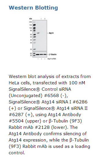 Atg14 Antibody 能够检测内源性的Atg14总蛋白。该多克隆抗体是通过用合成肽免疫动物制备的,该合成肽的序列与人Atg14的Val215周围的残基相一致。抗体通过蛋白A以及多肽亲和色谱法纯化。自噬是自噬溶酶体降解其所包裹的细胞质内容物的一个分解代谢过程(1, 2)。通常情况下,自噬在营养匮乏的时候被激活,但它还与许多生理过程相关,包括生长、分化、神经退行性疾病、感染和癌症(3)。自噬的分子机制主要在酵母中发现的,并称之为自噬相关基因(Atg)。这些蛋白与自噬体形成有关,自噬体就是被送往溶酶体进行降解的胞浆空泡。III型磷酸肌醇3激酶(PI3K)Vps34调控空泡的运输和自噬(4,5)。许多蛋白包括p105/Vsp15、Beclin-1、UVRAG、Atg14和Rubicon和Vsp34的功能相关(6-12)。Atg14和Rubicon能够与Beclin-1结合,并且参与具有相对功能的独特复合物的形成(9-12)。Rubicon主要集中于内涵体和溶酶体,能够抑制Vps34脂质激酶活性;Rubicon的下调可以增强自噬和内吞作用(11,12)。相反,Atg14集中于自噬体、隔离膜和内质网,能够增强Vps34活性;Atg14的下调可以抑制饥饿诱导的自噬(11,12)。