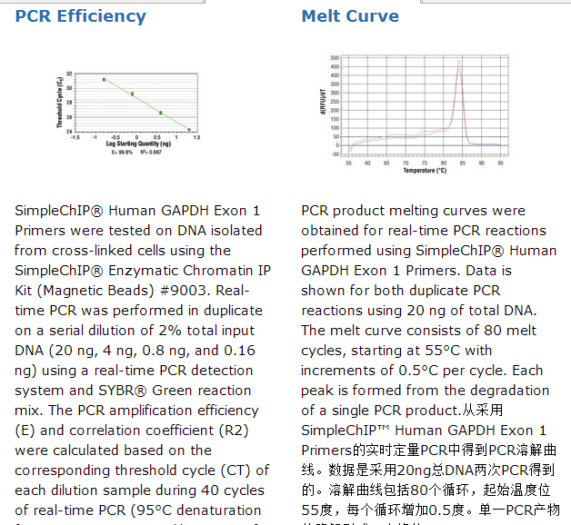 SimpleChIP® Human GAPDH Exon 1 Primers contain a mix of forward and reverse PCR primers that are specific to exon 1 of the human glyceraldehyde-3-phosphate dehydrogenase (GAPDH) gene. These primers can be used to amplify DNA that has been isolated using chromatin immunoprecipitation (ChIP). Primers have been optimized for use in SYBR® Green quantitative real-time PCR and have been tested in conjunction with SimpleChIP® Enzymatic Chromatin IP Kits #9002 and #9003 and ChIP-validated antibodies from Cell Signaling Technology®. The GAPDH gene is actively transcribed in all cell types and the exon 1 region is highly enriched for histone modifications associated with active transcription, such as histone H3 Lys4 tri-methylation and general histone acetylation. The exon 1 region shows very low levels of histone modifications associated with heterochromatin, such as histone H3 Lys9 or Lys27 tri-methylation.