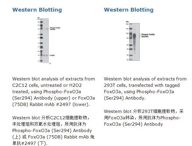 Phospho-FoxO3a (Ser294) Antibody detects exogenous and endogenous levels of FoxO3a protein only when phosphorylated at serine 294.