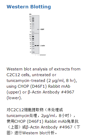 CHOP (D46F1) Rabbit mAb识别内源性的全部CHOP蛋白。该单克隆抗体用与人类CHOP蛋白中Leu159位点附近的氨基酸序列对应的人工合成肽段免疫动物而制成。CHOP被鉴定为一种C/EBP同源蛋白,以显性负调控的方式抑制C/EBP和LAP(1)。CHOP表达可以被某些细胞应激所诱导,包括饥饿,诱导的CHOP抑制细胞周期从G1进入到S期(2)。后来发现,在内质网应激时,CHOP表达水平升高,可以介导程序性细胞死亡(3)。研究也发现CHOP可以介导GADD34和Ero1-Lα在内质网应激时的表达。GADD34反过来对eIF2α的磷酸化Ser51进行去磷酸化,从而刺激蛋白合成。Ero1-Lα促进内质网内氧化应激(4)。CHOP在内质网应激后细胞程序性死亡中的角色与其能够促进内质网内蛋白合成和氧化应激有关(4)。