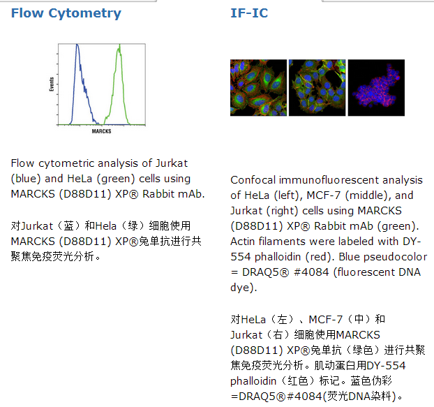 MARCKS (D88D11) XP兔单克隆抗体识别内源性的全部MARCKS蛋白。该单克隆抗体用与人类MARCKS蛋白中Ala245位点附近的氨基酸序列对应的人工合成肽段免疫动物而制成。豆寇酰化富含丙氨酸C-激酶底物(MARCKS)是一种重要的PKC底物,在多种细胞类型中表达。 MARCKS与细胞活力,细胞粘附,吞噬,膜运输和有丝分裂有关(1)。PKC响应生长因子和氧化应激磷酸化MARCKS的丝氨酸(159,163,167和170位),调节钙/钙调蛋白结合和MARCKS丝状(F)-肌动蛋白交联反应活性(2-4)。PKC磷酸化作用导致MARCKS从细胞膜到细胞质迁移(5)。