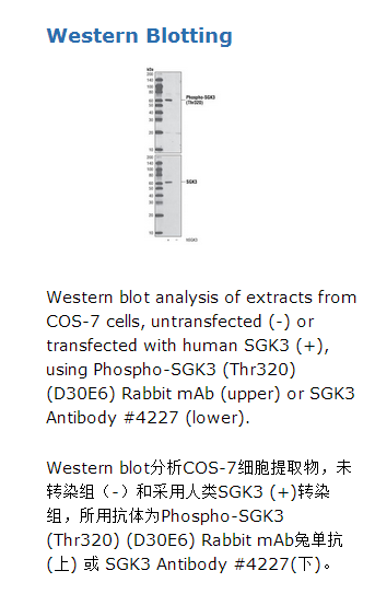 Phospho-SGK3 (Thr320) (D30E6) Rabbit mAb兔单抗可以检测Thr320位点被磷酸化的过表达水平的SGK3蛋白。单克隆抗体是采用人类SGK3蛋白的Thr320周围残基相对应的合成肽段免疫动物生产的。血清和糖皮质激素诱导激酶(SGK)是一个丝氨酸/苏氨酸激酶,与Akt紧密联系(1)。SGK可以被多种刺激包括血清,糖皮质激素,卵泡刺激素,渗透压冲击和盐皮质激素迅速诱导。SGK可以被肝细胞生长因子HGF刺激的PI3K依赖的通路和整合素介导的PI3K非依赖的通路激活(2,3)。SGK的诱导和激活参与激活细胞抗凋亡和细胞周期调控(4-6)。SGK在钾,钠,氯离子通道激活中也起重要作用,表明其参与调控细胞的存活,神经元的兴奋,肾钠排泄等过程(2)。SGK被泛素化和蛋白酶体降解等过程负向调控(7)。SGK1也可以调控多种靶蛋白,例如GSK-3, NEDD4, iNOS, AMPAR, PSD95, Tau, NF-κB, CREB, 和 FKHR-L1 (8,9)。SSGK3显示为一种PI3K信号通路的下游信号分子。在肿瘤中,它的激活和被PDK1在Thr320位点磷酸化可能是一种Akt依赖的信号转导(8)。