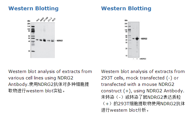 NDRG2抗体识别内源性的NDRG2蛋白.多克隆抗体是通过一种合成的肽段去免疫动物产生。这种合成的肽段与邻近人源NDRG2蛋白的Lys25氨基酸残基序列一致。NDRG(N-Myc下游调控基因)家族,由NDRG1, NDRG2, NDRG3, and NDRG4组成,是一组与结构调节相关的蛋白,在细胞增殖、分化、凋亡和应激反应、细胞迁移/转移中起作用[1-3]。NDRG1最初在N-Myc基因敲除小鼠中被鉴定为一种上调的蛋白[1]。NDRG家族蛋白,特别是NDRG1和NDRG2被报道在各种癌症组织中下调表达,提示其功能角色为肿瘤抑制因子[4,5].NDRG1和 NDRG2由p53和 HIF-1上调表达,并通过相关的信号通路调控细胞凋亡[6-11]。NDRG1 和NDRG2 也和神经系统病理相关。NDRG1基因的无义突变可引起遗传性运动和感觉神经疾病,这一理论也被一些有关NDRG1能保持髓鞘和轴突存活的研究所支持[12,13]。在阿尔茨海默病中也发现NDRG2的上调表达[14]。NDRG1和 NDRG2在多个位点被Akt 和 SGK1磷酸化。但是其磷酸化的具体生理机制尚不清楚[15,16].