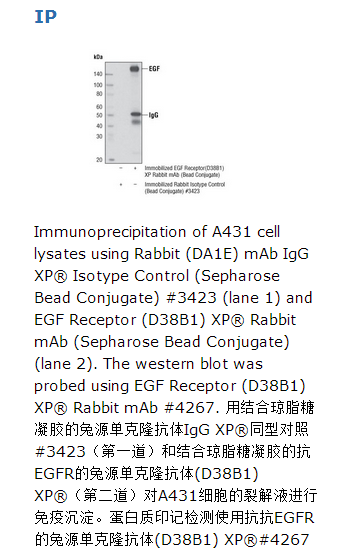 EGFR的兔源单克隆抗体(D38B1) XP®(偶联琼脂糖珠子)能检测内源EGFR的水平。本抗体不与ErbB家族的其它蛋白发生交叉反应。单克隆抗体通过免疫动物得到,作为免疫原的融合蛋白是含有人EGFR蛋白胞内区氨基酸序列。Cell Signaling Technology生产的抗体通过初级氨基基团与带有N-羟基琥珀酰亚胺的琼脂糖珠子共价结合。结合琼脂糖凝胶珠子的抗EGFR的兔源单克隆抗体(D38B1) XP®可用于免疫沉淀检测。该抗体与未结合珠子的抗EGFR的兔源单克隆抗体(D38B1) XP®(偶联琼脂糖珠子) #4267有着相同的种属交叉反应特性。表皮生长因子(EGF)受体是一个属于HER/ErbB蛋白家族的跨膜酪氨酸激酶。配体的结合导致了受体的二聚化,自磷酸化,下游信号分子的激活,内化以及溶酶体降解 (1,2)。表皮生长因子受体(EGFR)在激酶域Tyr845位点的磷酸化与稳定激活回路有关,并且维持了酶的激活状态,为底物蛋白提供了可结合的表位(3,4)。c-Src与 EGFR 在 Tyr845位点的磷酸化有关(5)。PLCγ的SH2结构域结合到磷酸化的Tyr992位点,将引起PLCγ介导的下游信号通路的激活(6)。EGFR Tyr1045位点的磷酸化则为c-Cbl生成一个主要的停靠位点,这个衔接蛋白将导致受体的泛素化以及EGFR活化后的降解(7,8)。GRB2衔接蛋白则结合到活化后的EGFR磷酸化的Tyr1068位点(9)。一对磷酸化EGFR残基(Tyr1148 and Tyr1173)为Shc支架蛋白提供了停靠点,这两个位点都与MAPK激酶通路的激活有关(2)。EGFR在特定的丝氨酸和苏氨酸残基上的磷酸化减弱了EGFR激酶的活性。EGFR羧基末端残基Ser1046 和 Ser1047被CaM 激酶II磷酸化,这两个丝氨酸任何一个突变都将导致EGFR酪氨酸自身磷酸化的上调(10)。