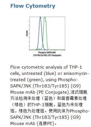 Phospho-SAPK/JNK (Thr183/Tyr185) (G9) Mouse mAb (PE Conjugate)鼠单抗能检测内源性能检测内源性Thr183和Tyr185双磷酸化的p46 、p54 SAPK/JNK蛋白水平。该抗体不能识别磷酸化的p44/42、p38 MAPK。该单克隆抗体是采用合成的与人源SAPK/JNK蛋白苏Thr183/Tyr185位点周围残基相一致的磷酸化肽段免疫动物而获得。该抗体经亲和层析纯化。抗体偶联了藻红蛋白(PE),并经过了内部测试,可用于人类细胞样本的流式细胞分析检测。预期该抗体与未偶联的抗体Phospho-SAPK/JNK (Thr183/Tyr185) (G9) Mouse mAb #9255具有相同的物种交叉反应性。应激活化蛋白激酶/Jun氨基末端激酶SAPK/JNK能够有效、优先地被多种环境压力激活,这些环境压力包括紫外照射和gamma 辐射、神经酰胺、炎性因子,在某些情况下也包括生长因子和GPCR激动剂 (1-6)。正如其他的 MAPKs,核心信号传导单元包括一个MAPKKK,通常是MEKK1-MEKK4,或一种混合谱系酶 (MLKs),这些MAPKKK激酶能磷酸化并激活 MKK4/7。活化后,MKKs磷酸化并激活SAPK/JNK 激酶 (2)。应激反应信号经Rho 家族(Rac, Rho, cdc42)的小GTP酶被传递到这个级联信号反应中 (3)。Rac1 和 cdc42蛋白都能调节MEKKs、 MLKs的激活(3)。另外一种情况是,MKK4/7能够通过生发中心激酶 (GCK)家族成员的刺激,在一个非GTP酶依赖机制中被激活 (4)。有三种不同的SAPK/JNK基因,而每一种都会经过选择性剪切产生多种异构体(3)。活化的二聚体SAPK/JNK,能转位到细胞核中,通过它对 c-Jun, ATF-2和其他转录因子的效应而调节转录过程(3,5)。