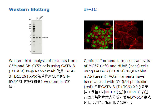 GATA-3 (D13C9)XP® Rabbit mAb兔单抗识别内源性的总GATA-3蛋白 。单克隆抗体由合成的肽段免疫动物产生。其合成的肽段与邻近人源GATA-3蛋白氨基末端的氨基酸残基序列一致。GATA-3是在小鼠和人的各种系统的发育中存在的关键调控因子[4]。GATA-3缺失的小鼠胚胎会因大脑和脊柱的生长迟缓和变形并在E11和E12之间致死[5]。GATA-3的功能已在T细胞发育中专门研究,近来显示它在Notch调控的TH2细胞分化中是Notch下游的靶标[6,7]。它在造血和非造血组织中表达,包括肾脏、皮肤、乳腺和中枢神经系统[8-10]。在管腔乳腺癌总GATA-3的减少与不良临床预后相关。GATA-3的表达水平可能因此作为很有希望的愈后标志物[11]。GATA-3单倍剂量不足导致人的Barakat综合症,这是感觉神经耳聋和肾发育不良的条件特征之一[12]。