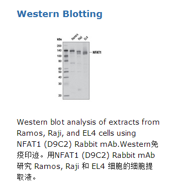 NFAT1 (D9C2) Rabbit mAb能够检测内源NFAT1蛋白总体水平。此单克隆抗体是通过合成人源对应的NFAT1 Glu915位点周围的肽段来免疫动物而获得。NFAT (T细胞激活的核因子)家族蛋白包括 NFAT1 (NFATc2或 NFATp), NFAT2 (NFATc1 或 NFATc), NFAT3 (NFATc4)和 NFAT4 (NFATc3 或NFATx)。此家族中的所有成员都是转录因子,具有一个Rel同源的区域和与AP-1 (Jun/Fos)相呼应的调控基因转录,从而管理形成高效的免疫系统(1,2)。NFAT 蛋白主要是在免疫系统的细胞中表达,但是也在骨骼肌,角化细胞,脂肪细胞中表达并调控这些细胞的分化过程(3)。在静息细胞中, NFAT蛋白被高度磷酸化并在细胞质中定位。细胞内的钙浓度增加能激活钙/钙调素依赖的丝氨酸磷酸酶,它能够激活NFAT蛋白,导致其随后的入核(2)。终止NFAT的信号发生在降低钙的浓度和通过GSK-3或CK1对NFAT的磷酸化后(3,4)。环孢菌素A 和 FK506 是免疫抑制剂能够抑制钙依赖磷酸酶并还原胞质中的NFAT蛋白(5)。