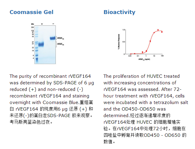 有载体: 每微克hVEGF164蛋白溶解在包含 20 μg BSA的PBS(pH 7.2)溶液中,并通过 0.22 μm 滤膜冻干。