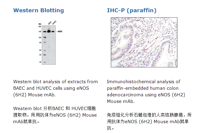 eNOS (6H2) Mouse mAb可以检测内源性总eNOS蛋白。单克隆抗体是采用针对人类eNOS蛋白的特异重组蛋白免疫动物而生产的。内皮一氧化氮合酶(eNOS)是心血管系统的一种重要的酶。它可以催化合成一氧化氮(NO)。NO是一种血压,血管重建和生成的重要的调节因子(1,2)。eNOS的活性受多个位点磷酸化的调控。研究最为透彻的两个位点是激活位点Ser1177 和抑制位点Thr495(3)。几种蛋白激酶包括Akt/PKB, PKA 和AMPK都可以在不同的刺激下通过 Ser1177位点的磷酸化来激活eNOS的活性(4,5)。相反,血管舒缓激肽和过氧化氢通过促进Ser1177的磷酸化和Thr495的去磷酸化来激活eNOS的活性(6,7)。