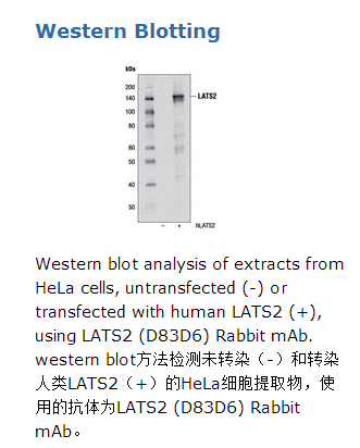LATS2 (D83D6) Rabbit mAb 能够检测转染的LATS2总蛋白。该单克隆抗体是有合成的人源的针对LATS2蛋白氨基末端的肽段免疫动物生产的。LATS2是属于NDR激酶家族的一种AGC激酶。它是LATS家族的一种肿瘤抑制基因,在中心体复制、有丝分裂保真度维持和基因组稳定性中发挥重要作用(1)。LATS2通过下调周期蛋白E/CDK2激酶活性来抑制G1/S转化时的细胞生长(2)。它也可以调节Hippo通路,该通路能够调节细胞增殖和促进凋亡从而控制器官大小和肿瘤的进程(3,4,5)。