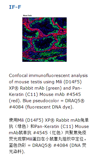 Mili (D14F5) XP® Rabbit mAb兔单抗检测内源性Mili总蛋白水平。通过人工合成小鼠Mili蛋白Leu118位点周围序列相应多肽片段去免疫动物从而制备单克隆抗体。果蝇piwi 基因被鉴定是生殖系干细胞自我更新所必须的(1)。在不同的物种包括拟南芥、秀丽隐杆线虫和人类中,Piwi同源物都很保守(1)。Miwi和Mili蛋白都是小鼠Piwi 同源物,且都包含有 C末端Piwi结构域(2)。Miwi和Mili蛋白结合到在雄性生殖细胞中Piwi-interacting RNAs (piRNAs),并且对小鼠精子的生成是至关重要的(3-5)。