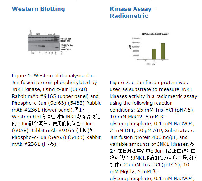 c-Jun Fusion Protein at a concentration of 0.5 µg/µl in a 20 µl reaction can be phosphorylated using active SAPK in an in vitro kinase assay with 1X Kinase Buffer (#9802) and 200 µM ATP (#9804). After a 30-minute assay at 30ºC, phosphorylation can be detected by Western blot with phospho-specific c-Jun antibodies (#9164 and #9261).