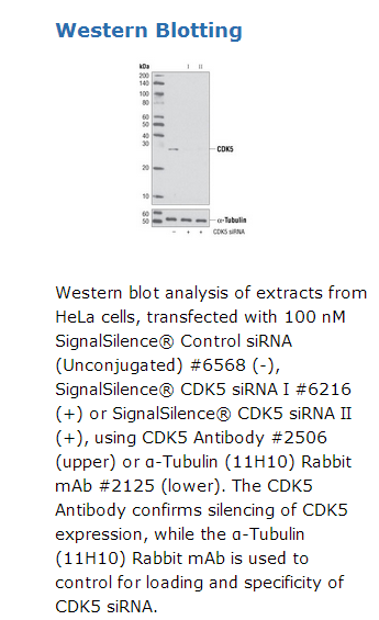 SignalSilence® CDK5 siRNA II from Cell Signaling Technology (CST) allows the researcher to specifically inhibit CDK5 expression using RNA interference, a method whereby gene expression can be selectively silenced through the delivery of double stranded RNA molecules into the cell. All SignalSilence® siRNA products from CST are rigorously tested in-house and have been shown to reduce target protein expression by western analysis.