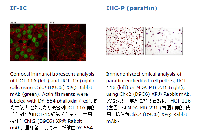 Chk2 (D9C6) XP® Rabbit mAb能够识别内源性Cnk2总蛋白。该单克隆抗体是由重组的人Chk2蛋白免疫动物生产的。.Chk2是哺乳动物中和芽殖酵母Rad53和裂殖酵母Cds1检验点激酶同源的蛋白(1-3)。Chk2的氨基末端结构域包含有一个七丝氨酸或者苏氨酸残基(Ser19, Thr26, Ser28, Ser33, Ser35, Ser50 and Thr68)组成的系列,每个系列紧跟着谷氨酸(SQ 或TQ模体)。这些地方是已知的ATM/ATR激酶磷酸化的首选作用位点(4,5)。电离辐射(IR)引起DNA损伤之后,UV照射处理或者羟基脲处理,这个区域的68位苏氨酸和其他位点被ATM/ATR磷酸化(5-7)。因此,SQ/TQ簇结构域似乎具有调节功能。第68位苏氨酸的磷酸化是后续激活步骤的先决条件,激活归因于激酶结构域激活回路中Chk2第383位和387位苏氨酸残基的自体磷酸化(8)。