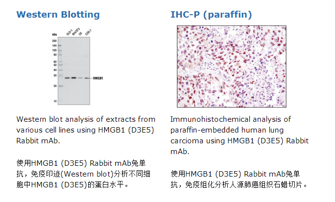 HMGB1 (D3E5) Rabbit mAb兔单抗能够检测内源性HMGB1总蛋白水平。该抗体不能与其它HMGB蛋白发生交叉反应,包含HMGB2和HMGB3蛋白。通过合成的与人源HMGB1蛋白Ala137位点周围相应的多肽片段去免疫动物从而制备出此单克隆抗体。High mobility group protein B1 (HMGB1)蛋白属于一个高度保守蛋白家族,其包含HMG box结构域(1,2)。所有三个家族成员(HMGB1、HMGB2和HMGB3)都包含两个HMG box结构域和一个羧基端酸性域。HMGB1蛋白是广泛表达和高度丰富的蛋白质(2)。HMGB2蛋白在胚胎发育期间高度表达,但是在成年动物中淋巴器官和睾丸中表达受限。在胚胎形成期间只有HMGB3蛋白被表达(4)。当表达不同时,不同家族成员的生化性能可能没有区别。HMG box结构域有助于HMGB蛋白结合到DNA的小沟,这导致DNA双螺旋的局部弯曲(1,2)。HMGB蛋白被招募,并且有助于位点特异性DNA结合蛋白装配到染色质它们的同源的结合位点。例如,HMGB1蛋白有助于Hox蛋白、Oct-1、p53、Rel蛋白和类固醇激素受体蛋白结合到它们的靶基因启动子上(1,2)。除了在细胞核内它们的功能之外,HMGB蛋白在与炎症有关的细胞外信号起着重要作用(5,6)。在细胞死亡期间而不是凋亡,HMGB1蛋白大量的释放到细胞外环境。通过作为一个炎性白细胞、平滑肌细胞和干细胞的化学引诱物,细胞外的HMGB1蛋白使自身免疫系统增强警戒性,这对于可溶性和颗粒抗原作为一个免疫辅助功能,并且引起T细胞和树突细胞激活。另外,活化的单核细胞、巨噬细胞和树突细胞也分泌HMGB1蛋白,这形成一个正向反馈环,从而导致额外的细胞因子和中性粒细胞的释放。研究证明在肝脏中低氧条件可引起HMGB1蛋白的释放,并且一些研究认为细胞外HMGB1蛋白在肿瘤稳态中起着一定作用(5,6)。
