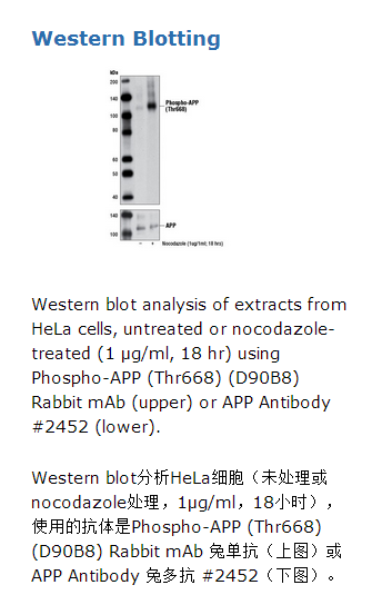 Phospho-APP (Thr668) (D90B8) Rabbit mAb 兔单抗识别内源性β淀粉样蛋白(A4)的前体蛋白的不同亚型,但只有在Thr668(或对其他亚型的相应位置)被磷酸化时才能识别。该单克隆抗体由合成的人类APP蛋白中Thr668位点附近肽段免疫动物而制成。淀粉样蛋白β(A4)前体蛋白(APP)是100-140 kDa的跨膜糖蛋白,存在几个亚型(1)。APP的氨基酸序列中包含的淀粉样蛋白域(A-β),它可以通过两步的蛋白裂解反应释放出来(1)。释出的A-β片段在细胞外沉积积累,形成在阿尔茨海默病中淀粉样斑块的主要组成部分(1)。APP可以在多个位点被磷酸化,进而影响其蛋白裂解和分泌过程。(2-5)细胞周期蛋白依赖性激酶介导的Thr688(对应于APP695亚型)磷酸化是细胞周期依赖性的,在G2/M期达到峰值(4)。APP的Thr668磷酸化形式存在于成年鼠大脑和相应的培养神经细胞及其分化细胞中(5,6)。
