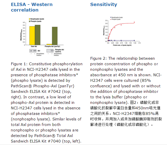 CST公司的磷酸化Axl (panTyr) Sandwich ELISA Kit #7042用于检测人细胞中内源性酪氨酸被磷酸化的Axl的表达(如图1)。图2显示试剂盒的灵敏度。内部检测显示,本试剂盒能检测列举出的物种蛋白,但不排除用于其它物种同源蛋白检测的可能。PathScan® 磷酸化Axl (panTyr) Sandwich ELISA Kit利用固相双抗夹心酶联免疫检测法对内源性酪氨酸被磷酸化的Axl蛋白进行检测。微孔中已经包被了抗Axl的小鼠源抗体,与细胞裂解液共孵育后,磷酸化的和未磷酸化的Axl均能被包被抗体捕获。多次洗板之后,加入抗酪氨酸被磷酸化的Axl的兔源抗体对被捕获的酪氨酸被磷酸化的Axl蛋白进行检测,然后加入HRP标记的抗兔的IgG对检测抗体进行识别,最后加入HRP的底物TMB进行显色反应。按照相对光单位,发射光强度与酪氨酸位点被磷酸化的Axl蛋白量成正比。Axl、 Sky和 Mer是 受体酪氨酸激酶 (RTK) 家族的三个成员,它们有共同的胞内酪氨酸激酶区域和与胞外粘附分子相似的胞外区。这些受体酪氨酸激酶与维生素K依赖性的生长停滞特异性6蛋白(Gas6)结合,Gas6蛋白与S抗凝血因子蛋白结构上相关(1)。与受体结合后,Gas6能够激活PI3K激酶和它的下游靶分子Akt、 S6K和 NF-κB (2,3)。大量证据表明Gas6/Axl信号通路与正常细胞和癌细胞的生长和存活相关(4)。