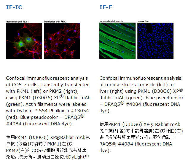 PKM1 (D30G6) XP® Rabbit mAb兔单抗可以检测内源性PKM1总蛋白水平。单克隆抗体由合成肽段免疫动物产生,该肽段与人PKM1蛋白Ala411邻近氨基酸序列一致。丙酮酸激酶是一种糖酵解酶,催化丙酮酸转变为磷酸丙酮酸。在哺乳动物中,M1亚型(PKM1)在大多数成年组织中表达(1)。M2亚型(PKM2)是M1亚型的一种可变剪切结果,在胚胎发育时表达(1)。研究发现癌细胞只表达PKM2(1-3)。PKM2对肿瘤的无氧糖酵解(Warburg效应)很关键(1)。当M2亚型转变为M1亚型时,癌细胞无氧酵解下降,氧化磷酸化增加(1)。在鼠异源移植时,这些细胞也显示出降低的成瘤可能(1)。最近的研究表明FGFR1的致癌形式直接磷酸化PKM2的Tyr105,从而抑制PKM2活性四聚体的形成(4)。一种PKM2突变在癌细胞中发现,Tyr105被苯丙氨酸代替,导致在低氧环境下细胞增生的减低和裸鼠上异源移植的肿瘤生长变缓(4)。这些发现表明Tyr105的磷酸化对癌细胞生长所需的代谢转变十分关键(4)。