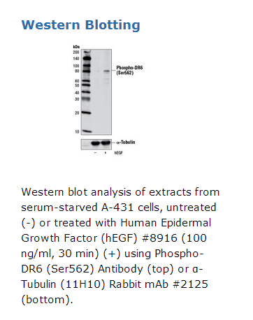 The tumor necrosis factor receptor family, which includes TNF-RI, Fas, DR3, DR4, DR5, and DR6, plays an important role in the regulation of apoptosis in various physiological systems (1,2). The receptors are activated by a family of cytokines that include TNF, FasL, and TRAIL. They are characterized by a highly conserved extracellular region containing cysteine-rich repeats and a conserved intracellular region of about 80 amino acids termed the death domain (DD). The DD is important for transducing the death signal by recruiting other DD containing adaptor proteins (FADD, TRADD, RIP) to the death-inducing signaling complex (DISC), resulting in activation of caspases.DR6, also known as TNFRSF21, is a TNFR family member able to induce apoptosis as well as activation of NF-κB and JNK (3). Expression of DR6 is upregulated by NF-κB signaling (4). DR6 appears to play a critical role in the activation and differentiation of T and B lymphocytes (5,6). In the nervous system β-amyloid precursor protein (APP) activates DR6 to trigger neuronal degeneration (7). Phospho-DR6 (Ser562) Antibody is directed at a site that was identified at Cell Signaling Technology (CST) using PhosphoScan®, our proprietary LC-MS/MS platform for modification site discovery using an Akt substrate antibody (8). Please visit PhosphoSitePlus®, our modification site knowledgebase, at www.phosphosite.org for more information.