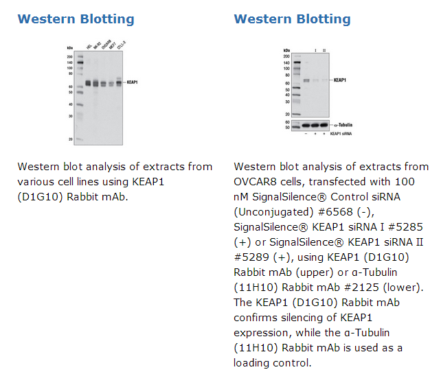 KEAP1 (D1G10)兔单抗是通过合成与人KEAP1蛋白Gly524邻近的氨基酸残基序列一致的肽段,免疫动物获得。 Western blot analysis of extracts from various cell lines using KEAP1 (D1G10) Rabbit mAb. 使用KEAP1 (D1G10)对不同细胞裂解物进行免疫印迹分析的结果。 Western blot analysis of extracts from OVCAR8 cells, transfected with 100 nM SignalSilence® Control siRNA (Unconjugated) #6568 (-), SignalSilence® KEAP1 siRNA I #5285 (+) or SignalSilence® KEAP1 siRNA II #5289 (+), using KEAP1 (D1G10) Rabbit mAb (upper) or α-Tubulin (11H10) Rabbit mAb #2125 (lower). The KEAP1 (D1G10) Rabbit mAb confirms silencing of KEAP1 expression, while the α-Tubulin (11H10) Rabbit mAb is used as a loading control. 使用KEAP1(D1G10)兔单克隆抗体(上)或α-Tubulin (11H10) Rabbit mAb #2125#2125(下)对转染100nM的SignalSilence®对照siRNA(非荧光偶联)#6568(-)、SignalSilence® KEAP1 siRNA#5285(+)或SignalSilence® KEAP1 siRNA II#5289(+)的OVCAR8细胞提取物进行免疫印迹分析的结果。 KEAP1(D1G10)兔单克隆抗体证实KEAP1的表达沉默,而α-Tubulin (11H10) Rabbit mAb #2125兔单克隆抗体用做上样对照。