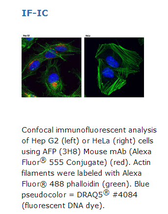 AFP (3H8) Mouse mAb (Alexa Fluor®555 Conjugate) recognizes endogenous levels of total AFP protein.