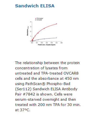 CST's PathScan® Phospho-Bad (Ser112) Sandwich ELISA Antibody Pair is being offered as an economical alternative to our PathScan® Phospho-Bad (Ser112) Sandwich ELISA Kit #7182. Capture and Detection antibodies (100X stocks) and HRP-conjugated secondary antibody (1000X stock) are supplied. Sufficient reagents are supplied for 4 x 96 well ELISAs. The Bad Capture Antibody is coated in PBS overnight in a 96 well microplate. After blocking, cell lysates are added followed by a Phospho-Bad (Ser112) Detection Antibody and an anti-Mouse IgG, HRP conjugated antibody. HRP substrate, TMB, is added for color development. The magnitude of the absorbance for this developed color is proportional to the quantity of Phospho-Bad (Ser112) protein. *Antibodies in this kit are custom formulations specific to the kit.
