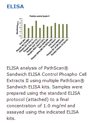 PathScan® Sandwich ELISA is a convenient tool for the analysis of protein expression as well as post-translational modifications (such as phosphorylation and acetylation) allowing the researcher to study signal transduction. PathScan® Sandwich ELISA Control Phospho Cell Extracts II can be used not only to troubleshoot the experiment but also provides the means to standardize the signal allowing the comparison of results obtained from different plates or experiments.