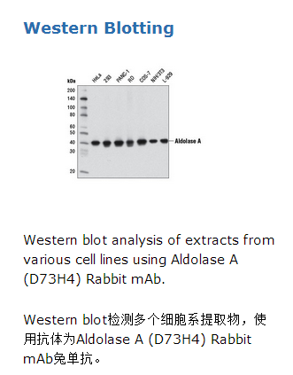 Aldolase A (D73H4) Rabbit mAb 能够检测内源性果糖二磷酸醛缩酶A总蛋白水平。该单克隆抗体是由合成的人源果糖二磷酸醛缩酶A蛋白脯氨酸(263位)肽段免疫动物制备的。醛缩酶(果糖二磷酸醛缩酶)是一种糖酵解酶,催化1,6-二磷酸果糖转化为3-磷酸甘油醛。这种无处不在的酶有三个不同的同工酶:醛缩酶A,醛缩酶B和醛缩酶C。研究表明醛缩酶A在非肿瘤性肝病及肝癌中有不同的表达量(1)。此外,在某些原发肿瘤病人中也观察到了醛缩酶B基因表达水平的变化(2,3)。
