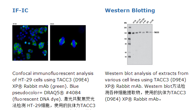 TACC3 (D9E4) XP® Rabbit mAb 能够识别内源性TACC3总蛋白的水平。该单克隆抗体是由针对人TACC3蛋白近氨基末端残基的肽段免疫动物生产的。转化酸性卷曲螺旋蛋白(TACC)是一个蛋白家族,其特征是羧基末端共有的约200个氨基酸的卷曲螺旋模体(1)。人类中已经鉴定出三个家族成员:TACC1,TACC2和TACC3。这些蛋白被认为参与中心体微管装配且其染色体区域定位在一些癌症中是被破坏的(2中已论述)。TACC3被认为在多种癌细胞系中表达上调(3)。当其558位丝氨酸被极光激酶A磷酸化时,哺乳动物TACC3向有丝分裂纺锤体定位且增加微管的稳定性(4,5)。鉴于此,监控磷酸化TACC3的定位将是确定极光激酶A抑制剂效力的有效方式,而极光激酶A抑制剂是很有前景的抗癌药物(6,7)。此外,研究发现TACC3是一个有效的非小细胞肺癌的预后标志物(8)。